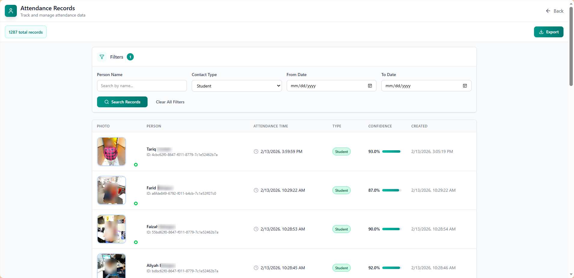 - Shows student photos and IDs.