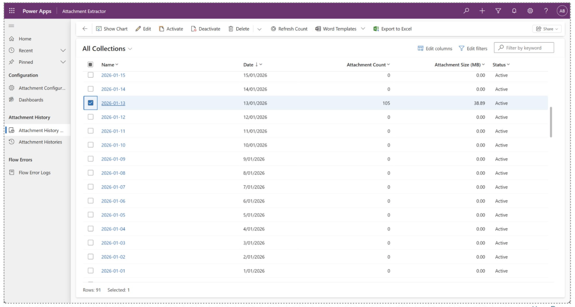 To assist with reporting, an Attachment History Collection is automatically created daily which stores the total count and size of all attachment histories for a given date. These records are used in dashboards too. If required, they can be manually refreshed via the command bar.
