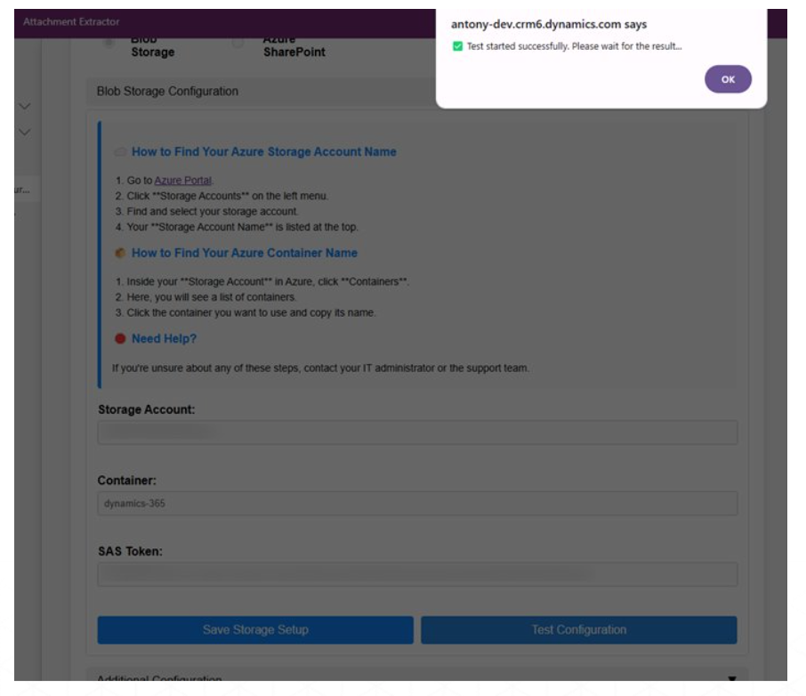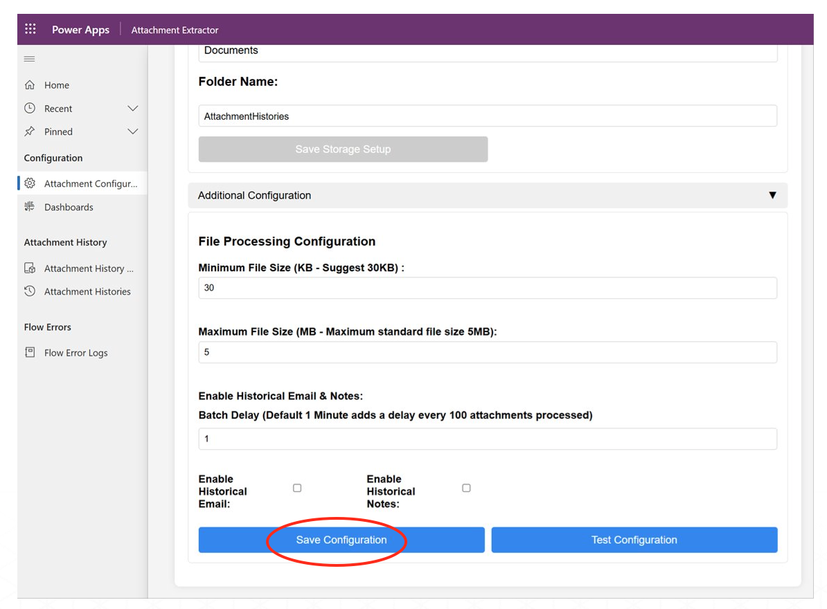 After successful test, we can proceed with using the Attachment Extractor for SharePoint. Click on Enable Configuration to run the app with the stored details. Wait a few minutes for the system to be triggered.