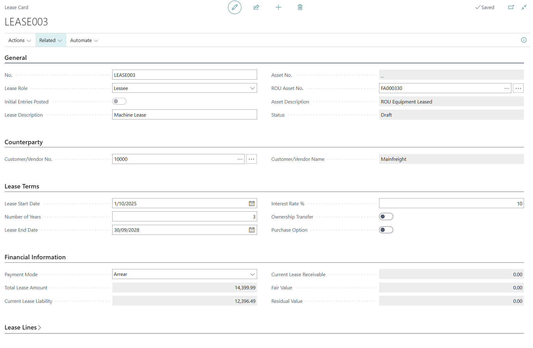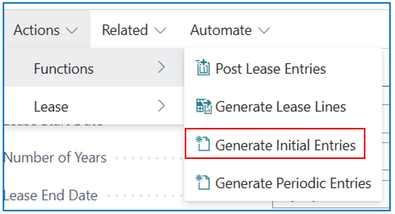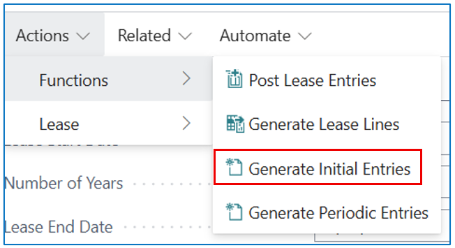 - Residual Value – if there is a residual value to be included in the PV calculation Generation of Lease Lines can also be done by selecting [Actions] > [Functions] > [Generate Lease Lines].
