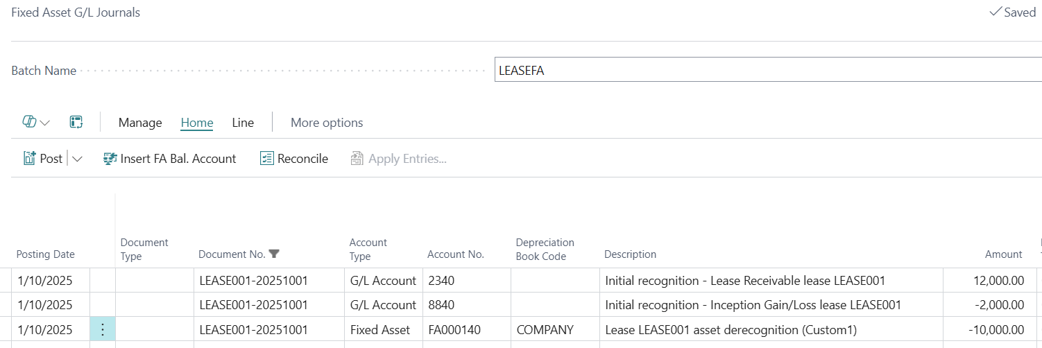 The initial entries for lease recognition will then be created in a Fixed Asset G/L Journal to derecognise the asset.