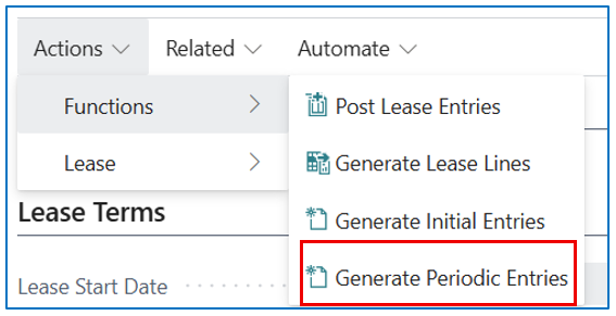 Once the lease details are confirmed on the lease card, select [Actions] > [Functions] > [Generate Lease Lines] to compute the monthly amortisation based on the interest rate %, the lease term and the monthly lease payment.