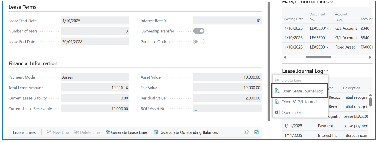 These periodic journal entries remain in Lease Journal Log (General Journal Batch) until posted. To view these entries, select the [Open Lease Journal Log] from the Lease Journal Log FactBox, or search “Lease Journal Log” page)