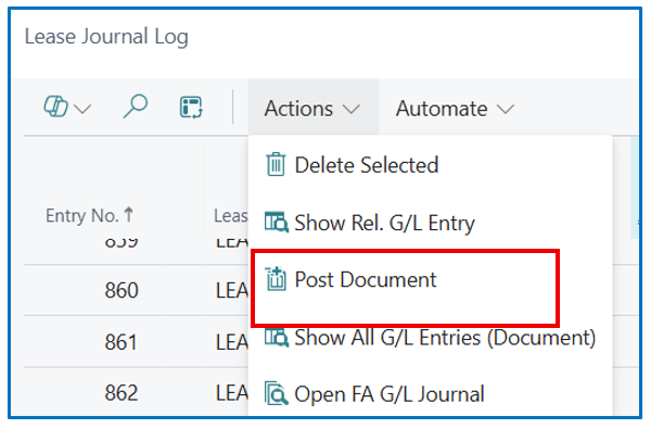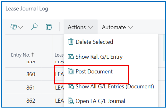 From the Lease Journal Log list, select (or multi-select) the journal lines to be posted and select [Actions] > [Post Document] to post the GL journal lines.