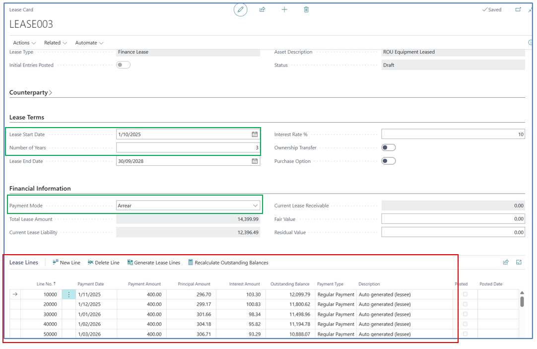 The Lease Lines FastTab section provides the monthly lease payment amortisations and interest expense per period for the entire lease term, according to the Payment Mode.