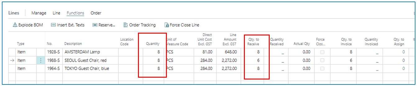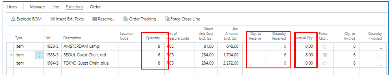 In this example, the 2nd PO line has only received 6 pcs instead of the ordered 8 pcs. The PO is Receive posted to show the unmet quantity.