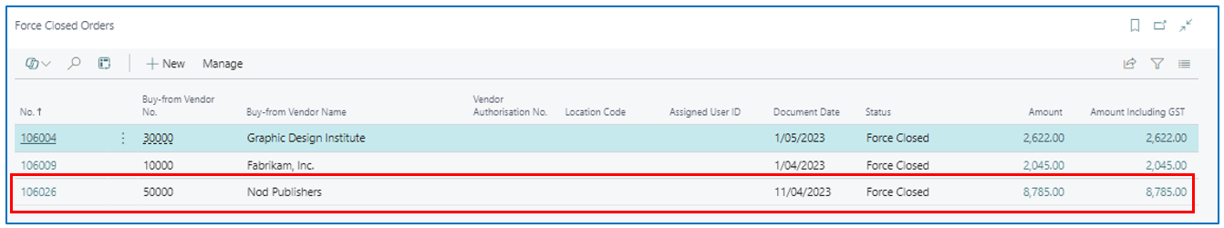 Once accepted (YES), the un-invoiced Purchase Order with “Force Closed” status will be moved to the new page “Force Closed Orders”.