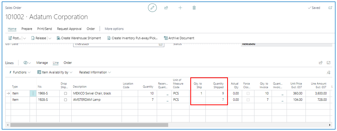 Navigate to the line with insufficient stock. After confirming the stock quantity to be shipped in Qty. to Ship, post “Ship” the order.