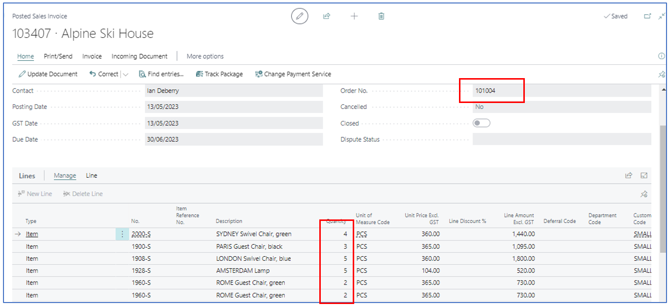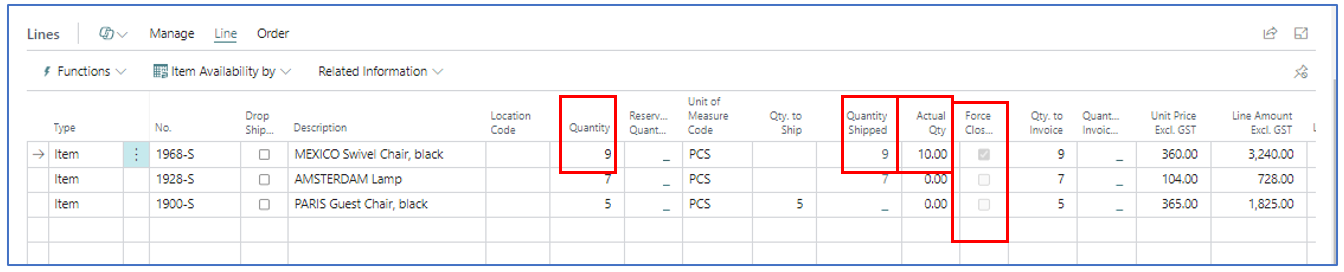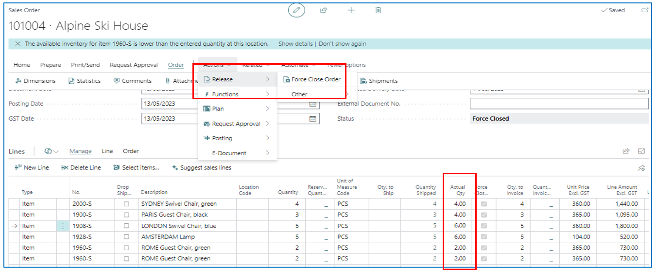 After the sales order has been Force Closed, the shipped quantities are confirmed, and the order can be invoice posted to send the correct sales invoice to the customer. The Sales Order is also archived.