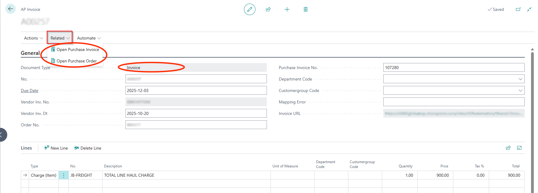 The system is equipped to automatically recognize and extract additional charges from an invoice, such as freight, insurance, or customs fees. The allocation of these costs is governed by the configuration on the vendor card, specifically the Item Charge Vendor settings detailed previously. This ensures that supplementary costs are correctly applied to the relevant inventory items for accurate financial valuation. For full traceability, users can easily view the related Purchase Order and the created Purchase Invoice directly from the related documents tab on the AP Invoice document page.