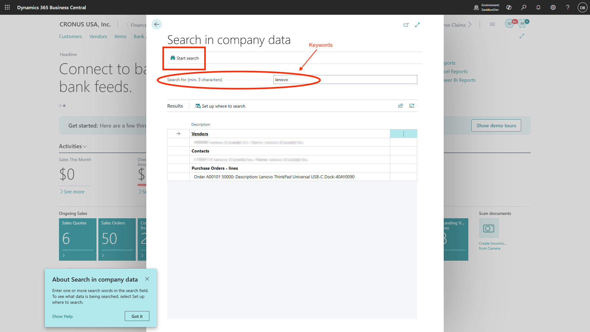 Business Central’s global search makes locating information easy: