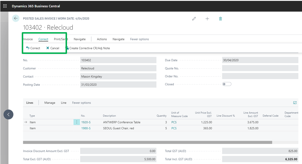 Microsoft Dynamics 365 Business Central Correcting Posted Invoices