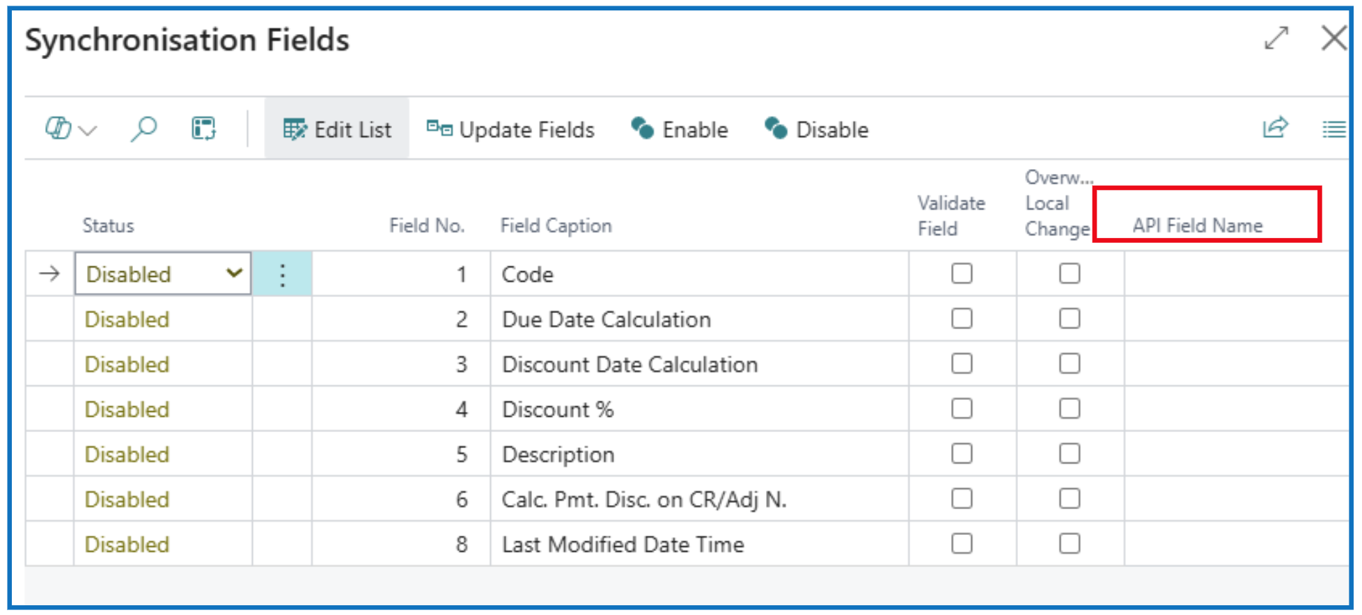 When a table is selected, the fields are displayed. Enable the field to synchronise and enter the API Field Name.