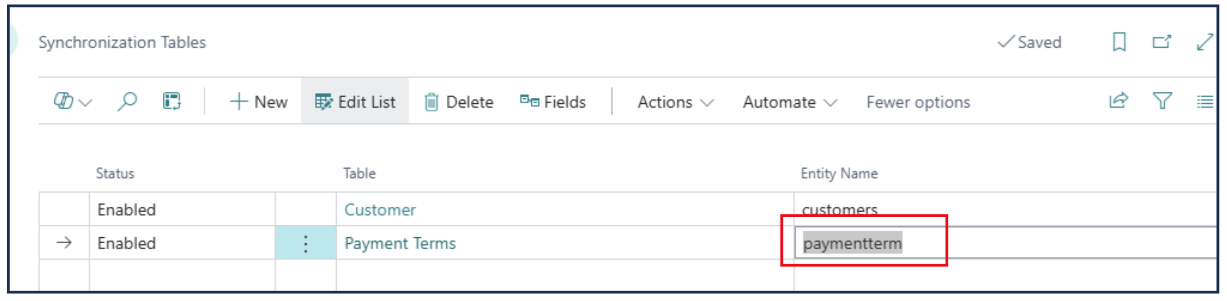 The new table object is added and Enabled. Next is to enter the Entity Name (derived from the API used).