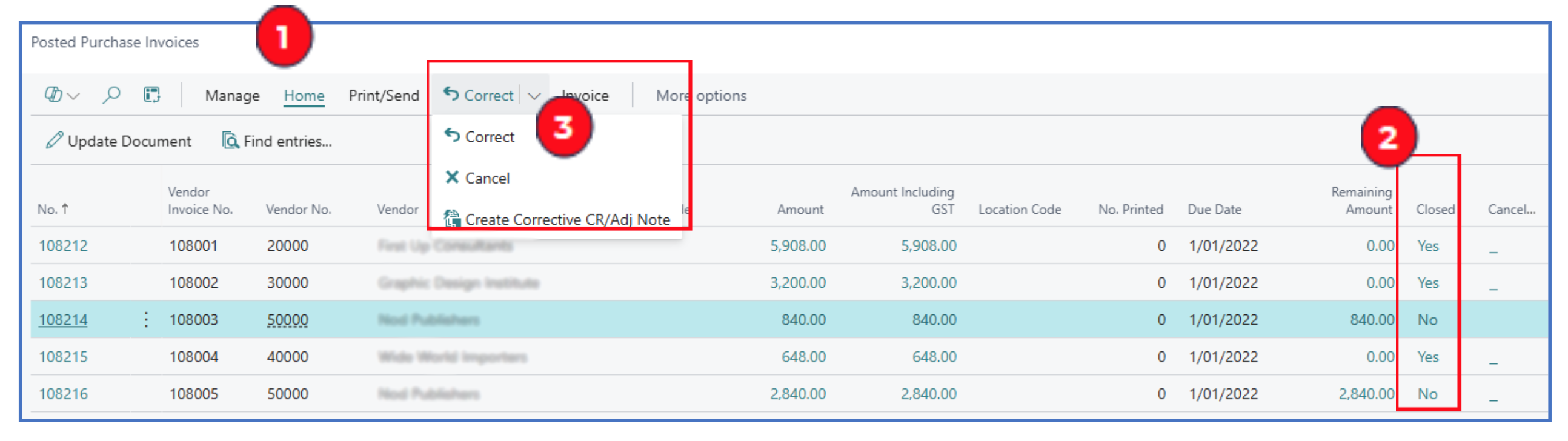 Invoices that can be corrected are marked with No in the Closed status column. Identify and highlight the vendor and invoice to correct.