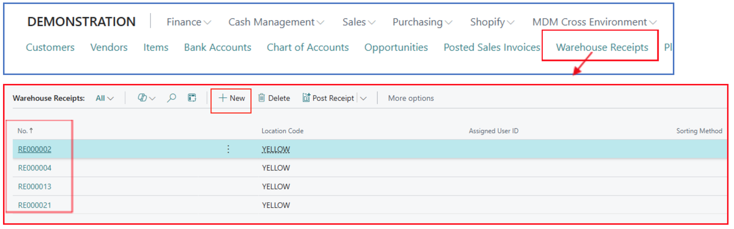 Use the menu option Warehouse Receipts to navigate to the warehouse receipts list page.