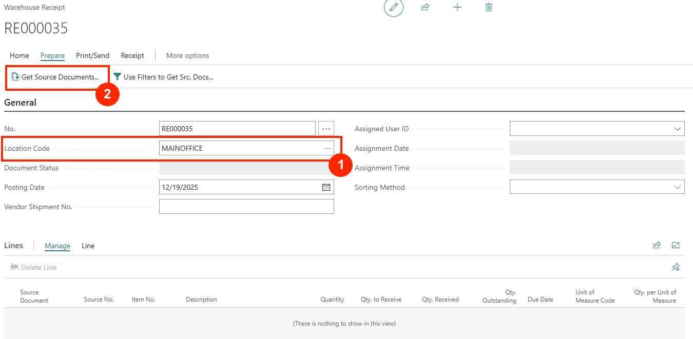 Click on menu option Prepare > Get Source Documents. This opens a page listing all “released” purchase order lines for the selected location.