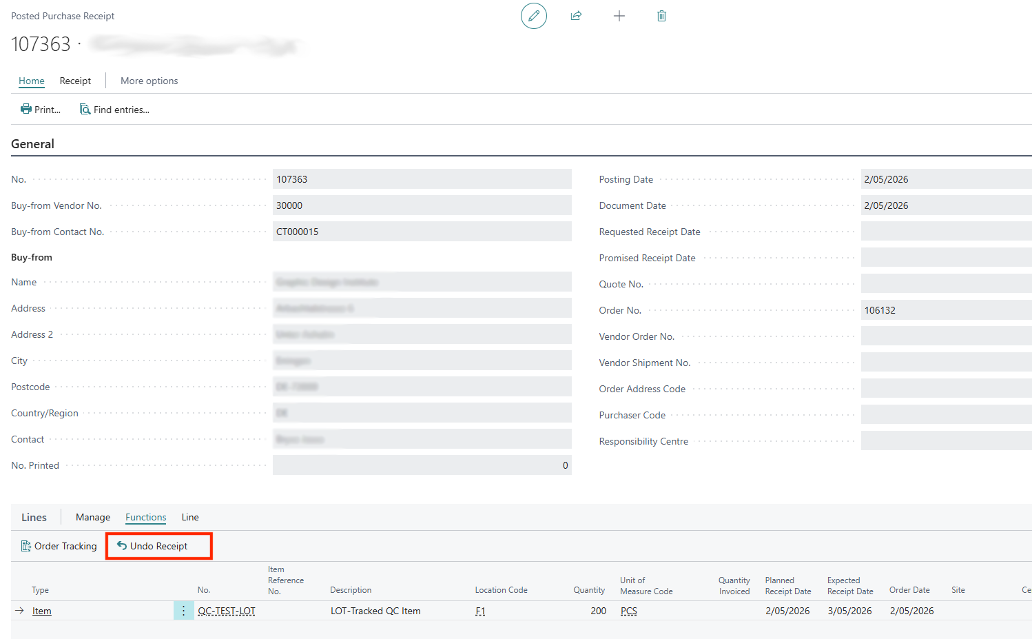 Look for the Posted Purchase Receipt and click on the No. (number) to open the posted purchase receipt page.