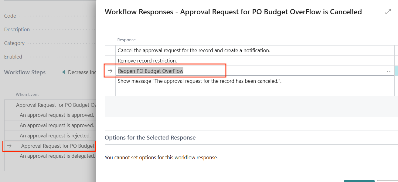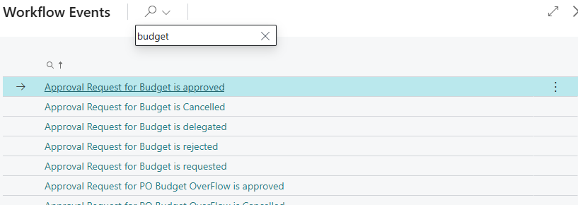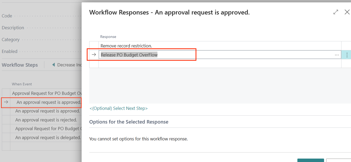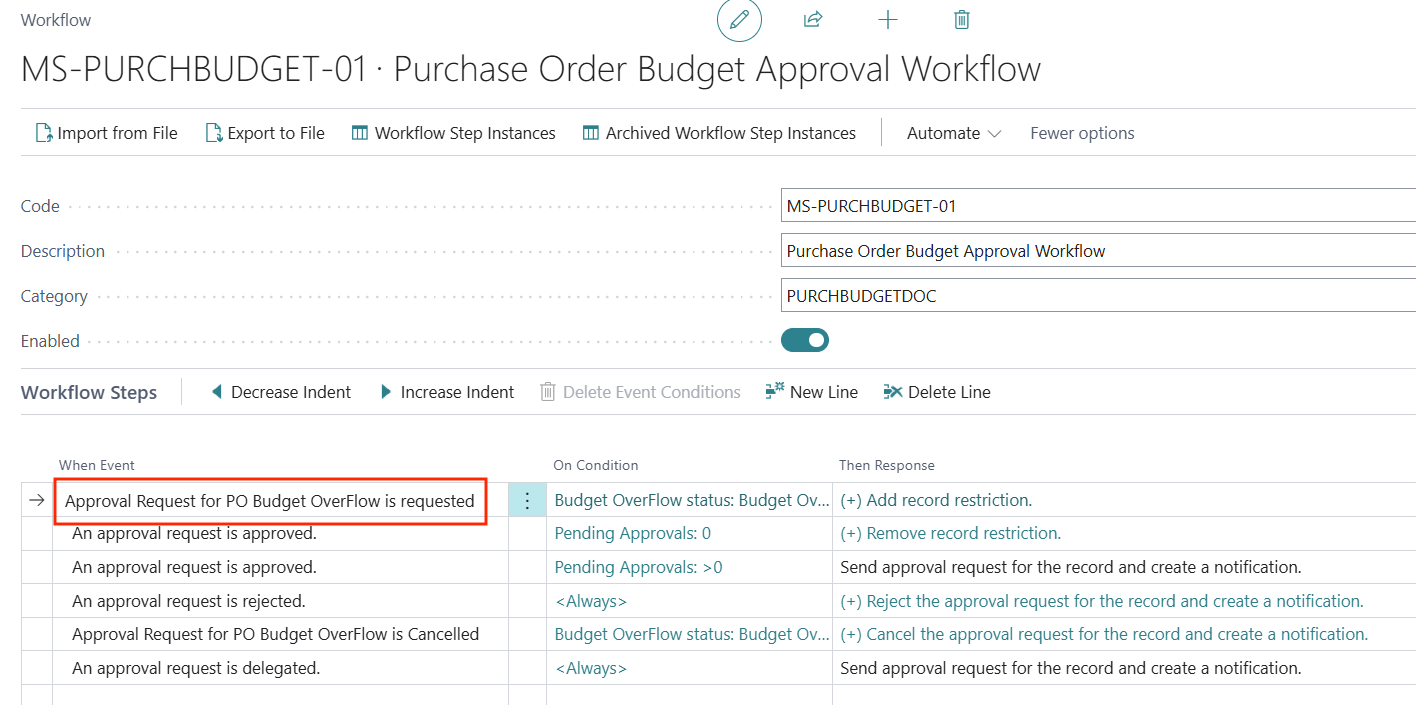 The Budget Overflow Approval Workflow uses the Approval Request for PO Budget Overflow event as shown below: