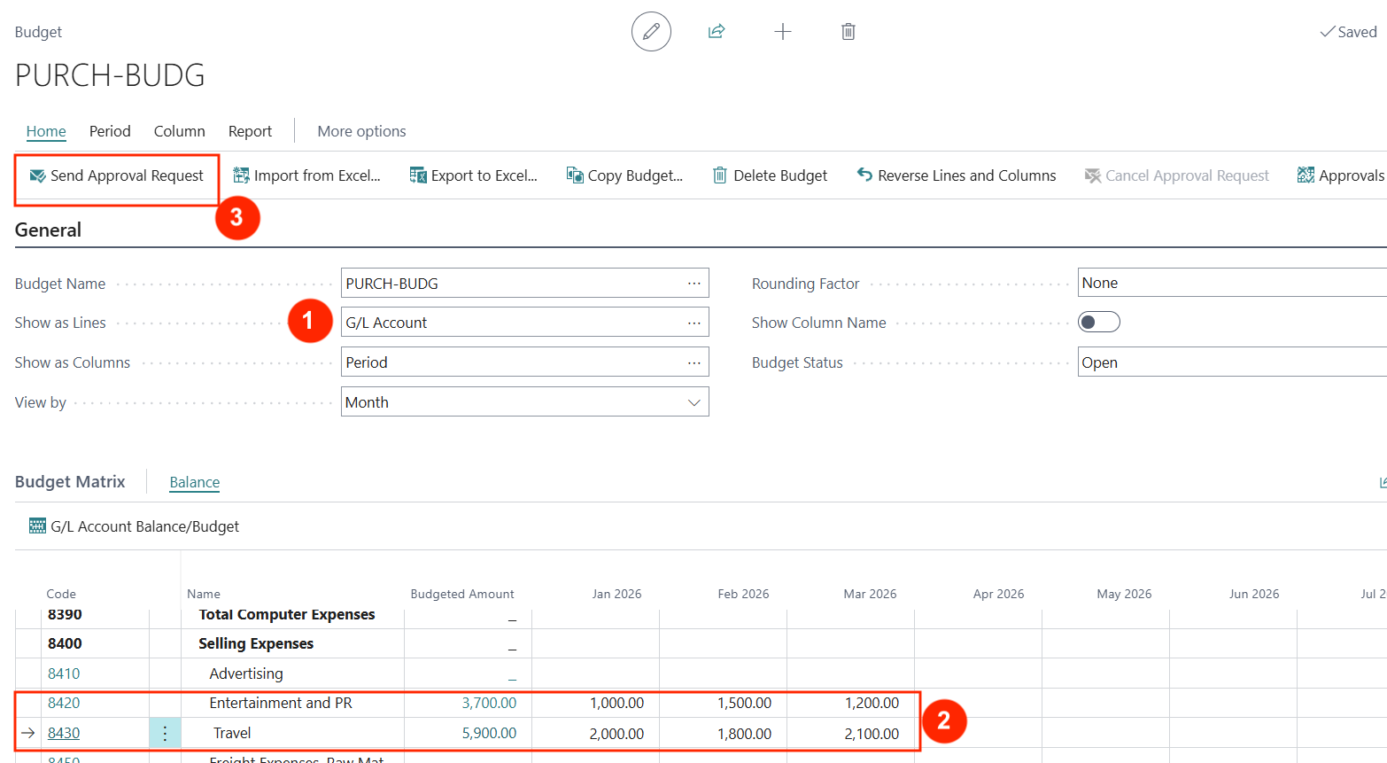 Send Approval Request — Send the budgets (by G/L Account) for pre-approval.