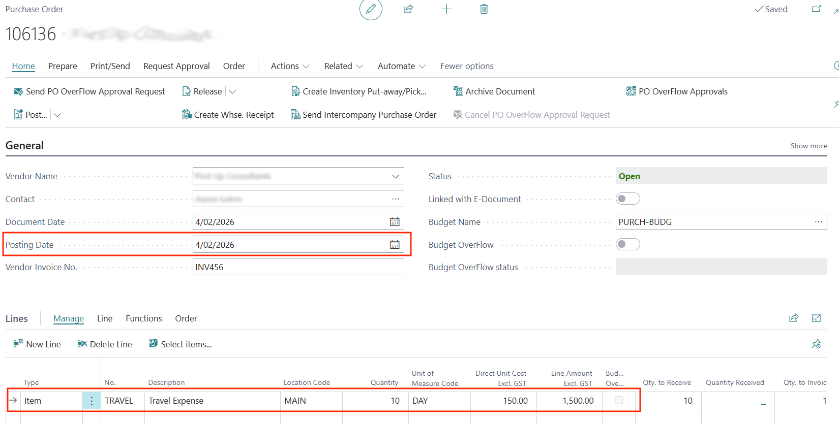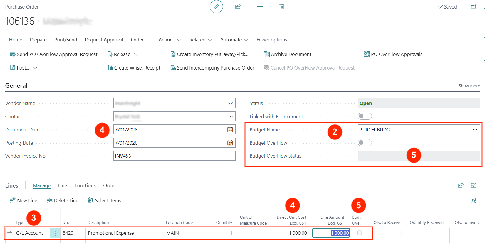 The PO line budget check compares the Line Amount excl. GST with the G/L account budget for the same posting period.
