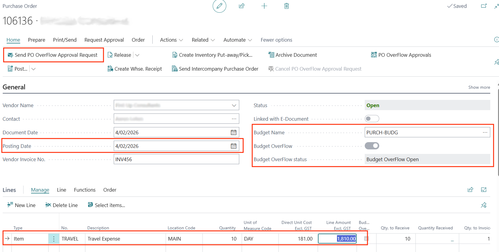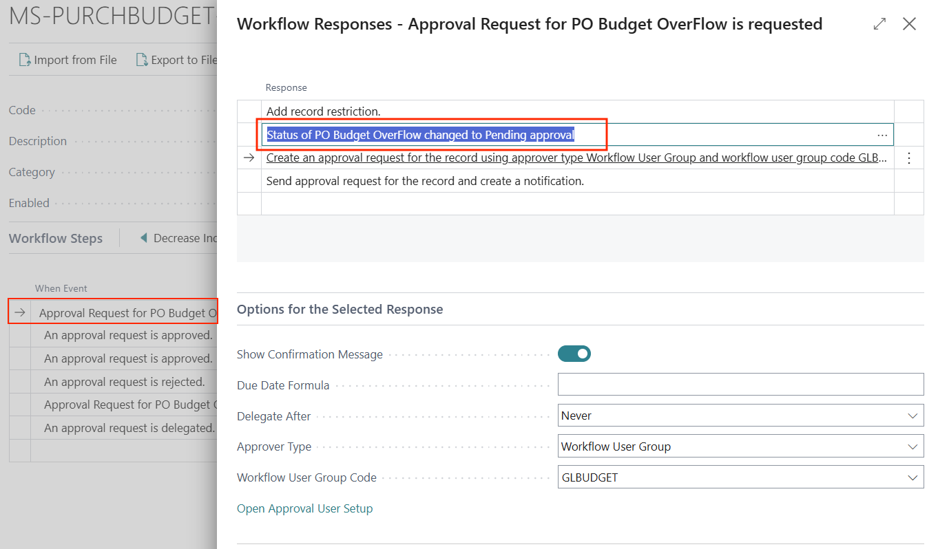 To approve a budget overrun for the period, based on the G/L Account Budget, the Purchase Order must be sent for budget overflow approval.