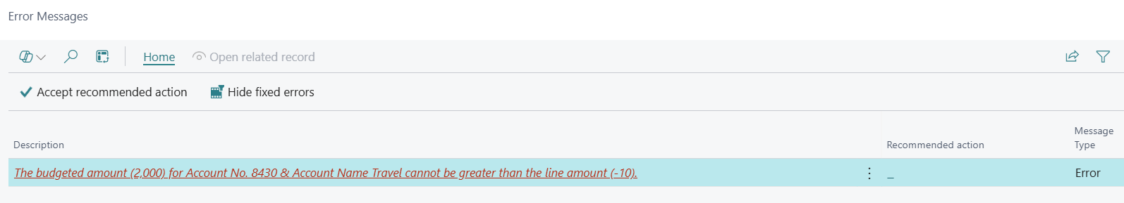 Our Purchasing Budget Control app takes a more proactive approach where the purchase amount (Purchase Order or Purchase Invoice) triggers a direct check with the budget against which the purchase is consumed. Each line amount designated against the implied G/L account is compared with the approved G/L account budget for the period, and the system triggers a Budget Overflow (if the line amount is greater than the budget) that stops the purchase from being posted. In this version, each line amount (line type of Item or G/L Account) is validated against the account budget independently.