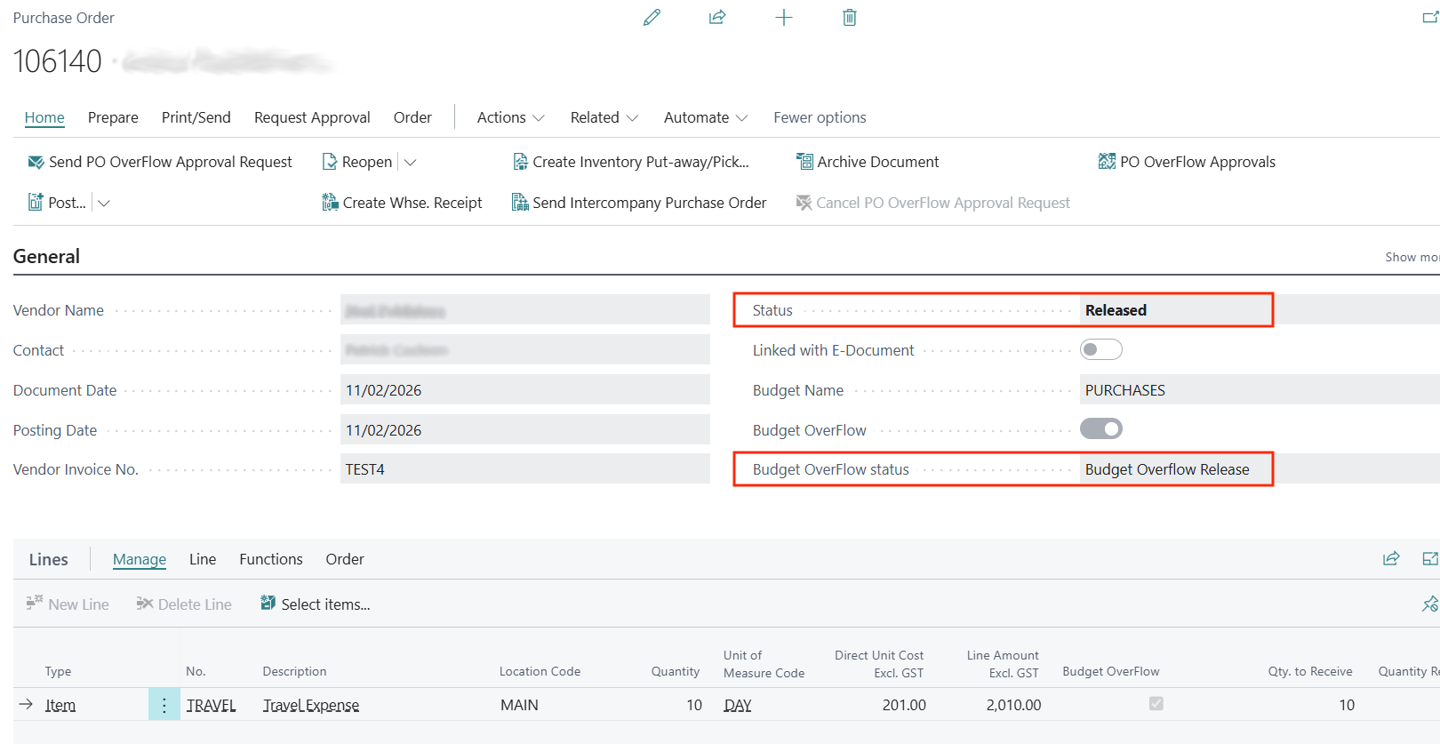 Once the budget overflow is approved, the status will revert to Budget Overflow Release and the Purchase Order status becomes Released and can be posted.