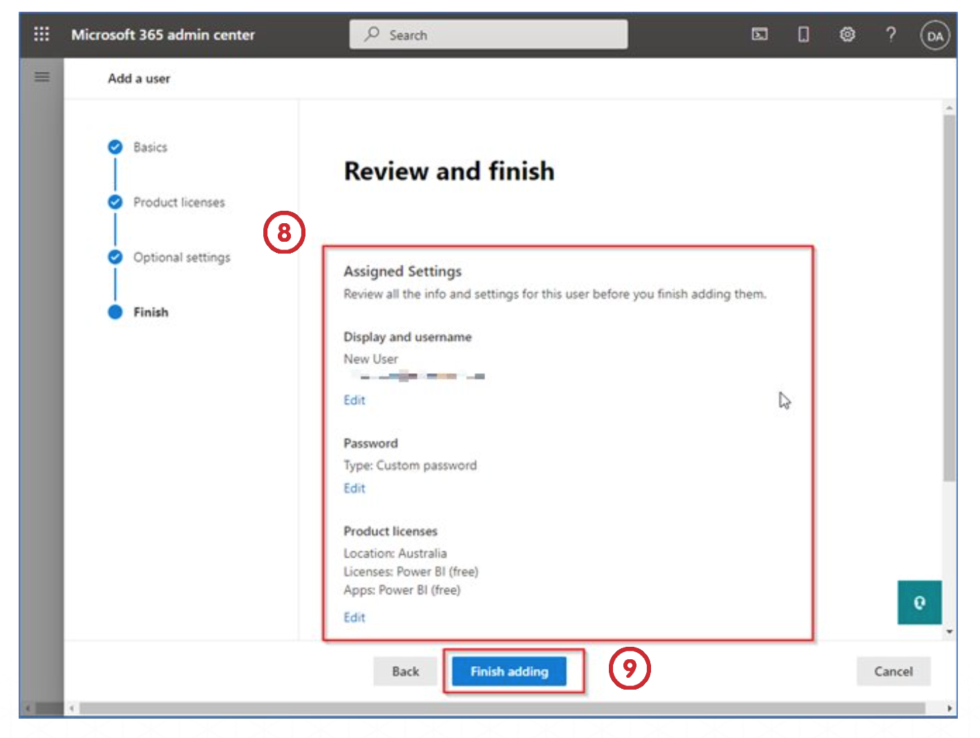 To confirm user creation, click the Finish adding button.