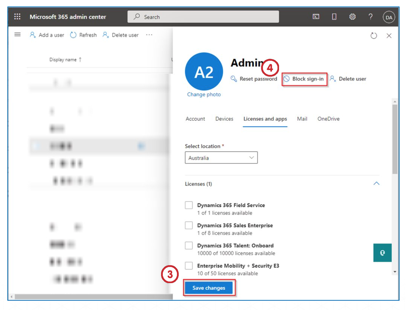 When a person leaves the company, their license must be disabled. To disable the license of a user, open the Admin Center, and select the user whose license must be disabled.