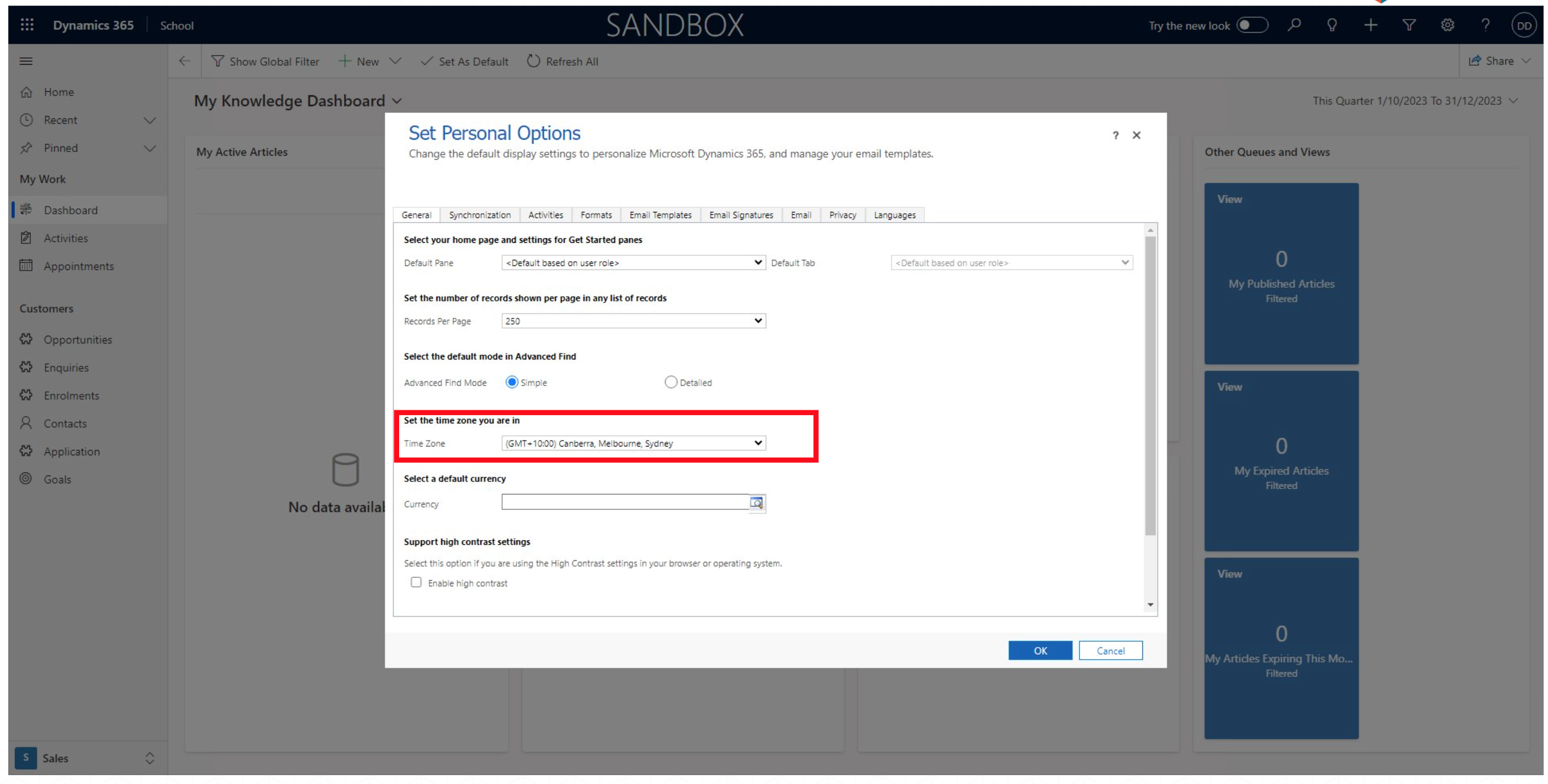 All your personal preferences are configured here. In the highlighted example you can Set the time zone you are in by clicking the drop-down box and choosing where you are located.