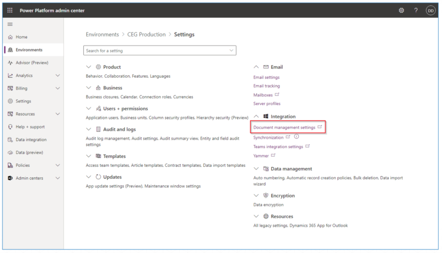Document Management Settings in Dynamics 365 (which are configured through the Power Platform admin center) are the core configurations that enable and control how your Dynamics 365 environment interacts with external document storage, most commonly SharePoint Online. These settings determine where documents are stored, how they are linked to Dynamics 365 records, and what entities will utilize document management.