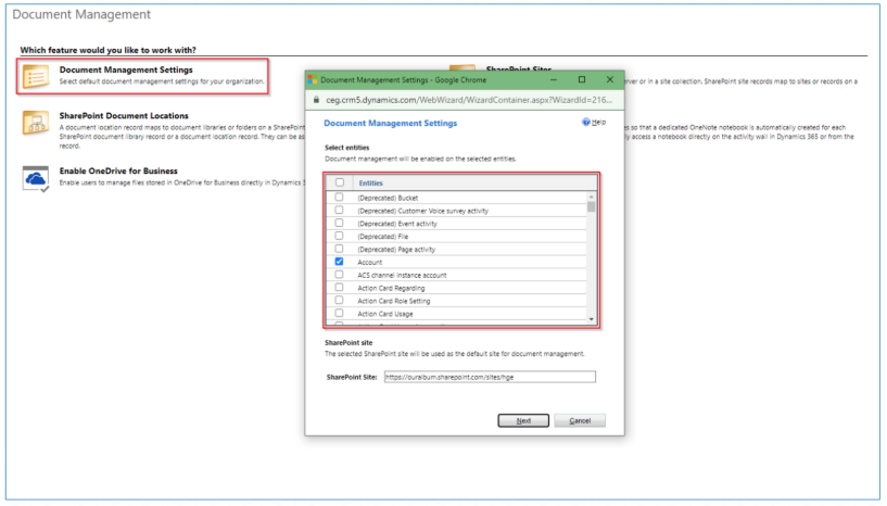 Choose Entities for Document Management: This is where you select which specific Dynamics 365 entities (tables) will have document management enabled. By default, common entities like Account, Lead, Opportunity, Quote, Product, and Article are often pre-selected. You can add or remove entities based on your business needs.
