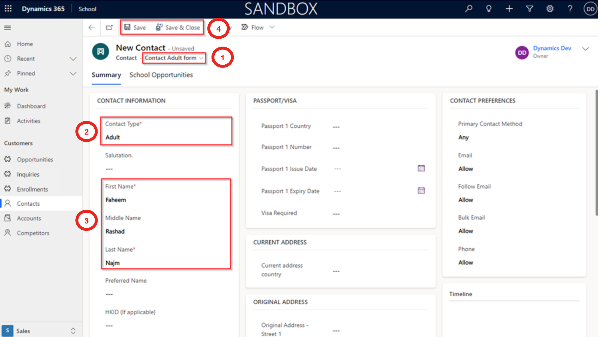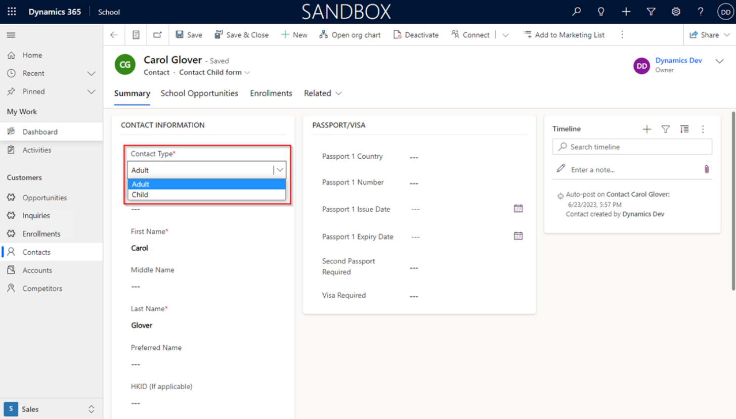 To differentiate between Adult and Child records, the Contact Type option set field is used. This field provides a categorization mechanism by offering values such as Adult and Child. By selecting the appropriate Contact Type value for each record, users can accurately classify whether the Contact represents an adult or a child. For example, a child is a student, and an adult is a parent.