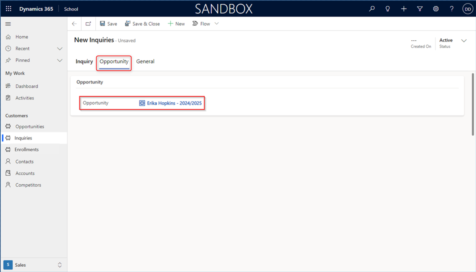 Upon saving an Inquiry, an automated process triggers the creation of a related Opportunity. Here is the flow: