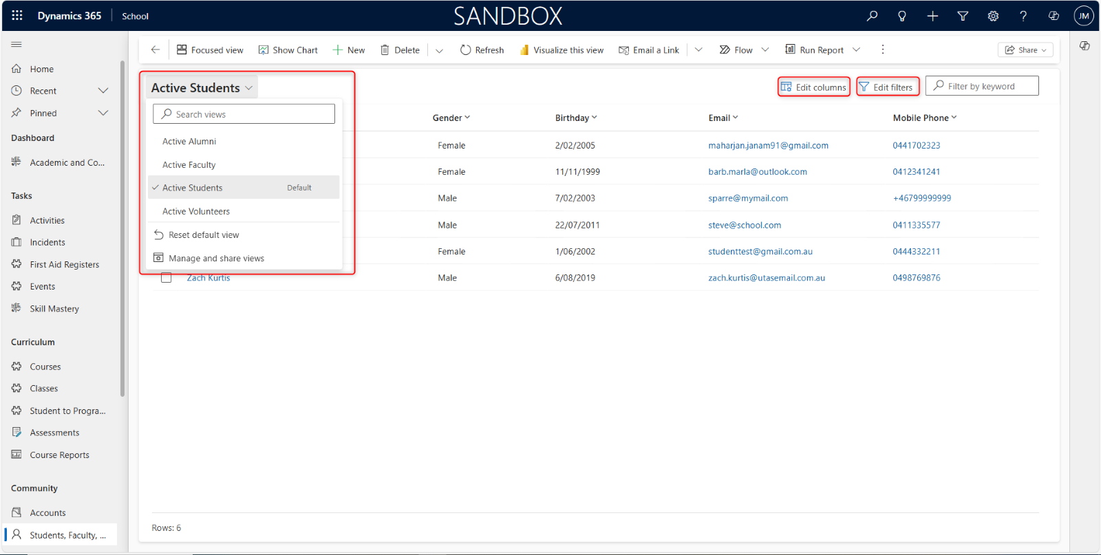 Views appear inside your Dynamics 365 dashboard. For example, in the image above, you can see the Active Opportunities view with a search box to query for information. To the right you can see the Edit Columns and Edit Filters button. Columns are the data stored for a particular view, like Active Opportunities. Filters are how you want to view the data, based on a criterion which you can specify using Filter by keyword. Type your keyword and hit enter on your keyboard to display the view.