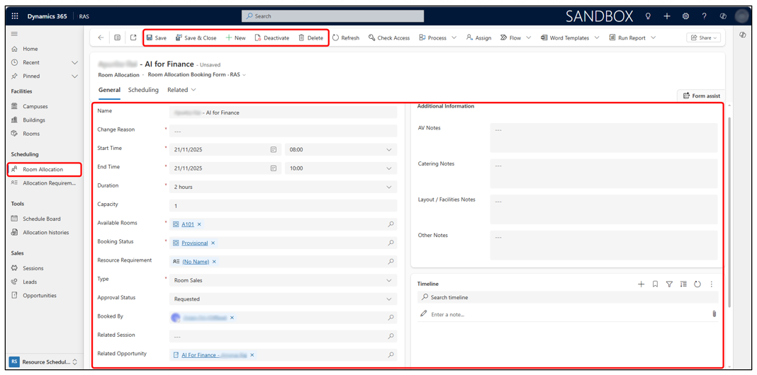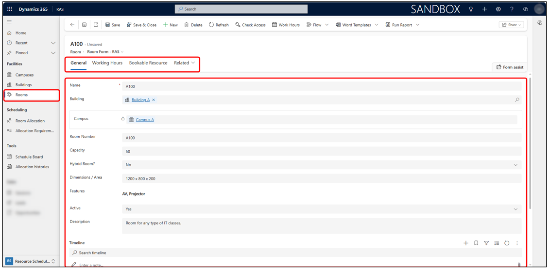The Room Allocation System (RAS) app is a central module within Microsoft Dynamics 365 that manages all programme rooms, meeting rooms, and event venues across an organization. It ensures that allocations are accurate, conflict-free, and fully traceable. This is ideal for schools and universities to ensure proper scheduling of rooms for meetings, events, and conferences.