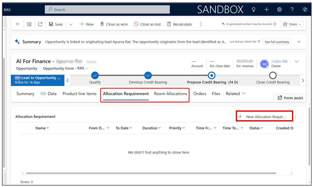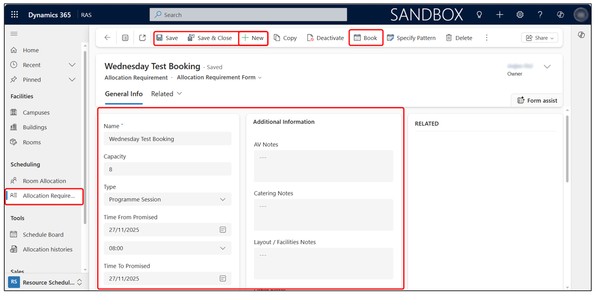 - Click + New on the command bar and enter the required details for room allocation. You may associate an existing Allocation Requirement to create a new one or leave it empty (RAS will automatically create and link an Allocation Requirement based on the entered information).