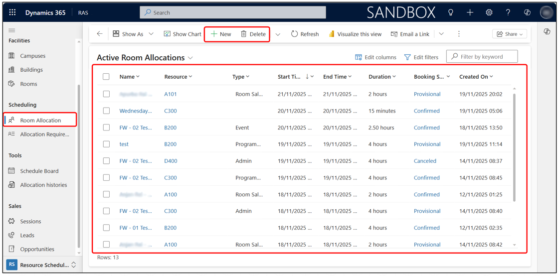 Go to Scheduling > Room Allocation in the left navigation pane. This page displays a list of all active, provisional, confirmed, and cancelled room allocations.