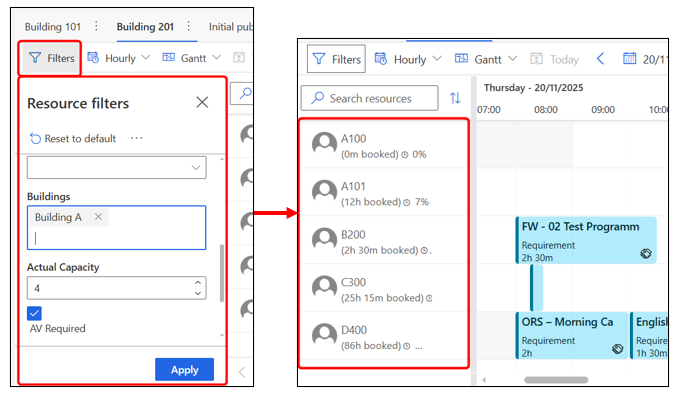 - Filters: Apply filters to show only specific rooms/resources (e.g., by capacity, campus, building, etc).