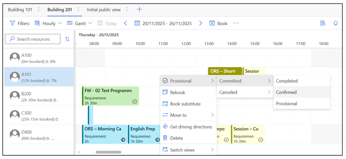 - Right-click on a booking to change the allocation status (e.g., update from Provisional → Confirmed).
