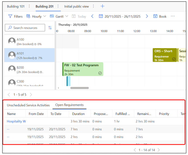 The Open Requirements / Unscheduled Activities panel displays all allocation requirements that still need room assignments.