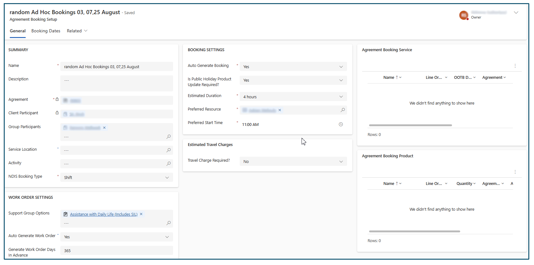 With the setup so far, we would have generated one GROUP Booking record for the said date. Regarding the Billing data, we will visit the Billing Agreement for the said Participant. We will set up the Invoice to generate 1 off invoice or we will simply create a Booking setup which would include the products / service and generate the Work Order from there. This one should not generate BOOKING as it is only for Billing.