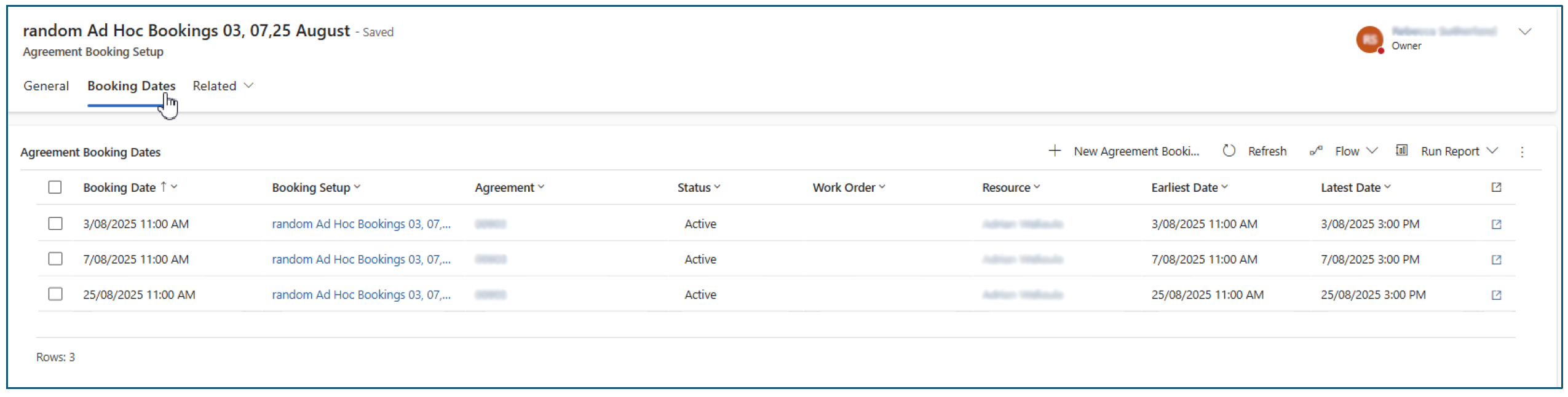 We can verify the setup by checking the Agreement booking Dates of the related Agreement Booking Setup record. Simply navigate to the Agreement Booking Dates tab. Here we will see 3 Booking Date records for the dates mentioned.