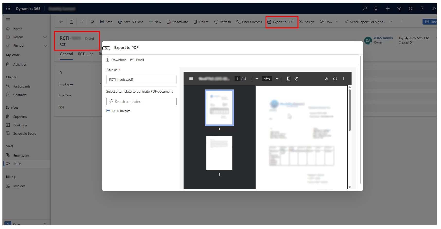 Microsoft Dynamics 365 NDIS RCTI Contractor Invoice