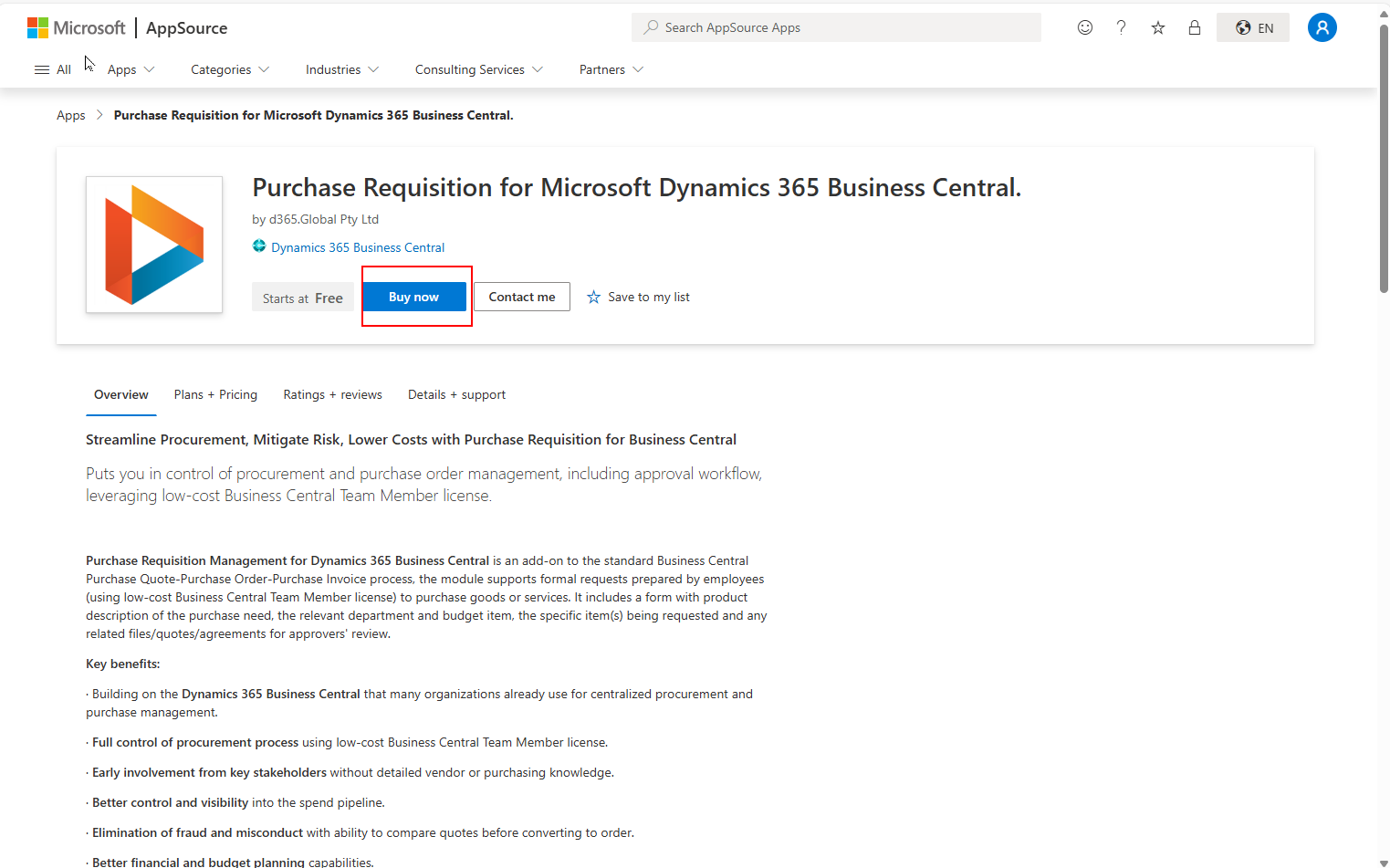 The user needs to download the extension from the link on Microsft AppSource - Purchase Requisition for Microsoft Dynamics 365 Business Central and click on Buy Now.