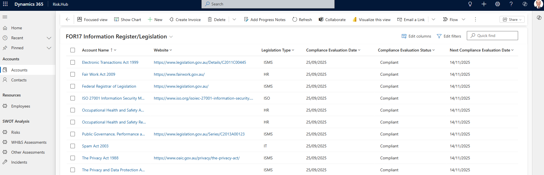 A Compliance Register is a structured repository that links specific risks to applicable legislative requirements. By integrating this feature within Dynamics 365, organisations can associate each risk record with detailed compliance information, including relevant legislation, reference links, legislation type, compliance status, and evaluation dates. This integration promotes proactive compliance management and supports audit readiness.