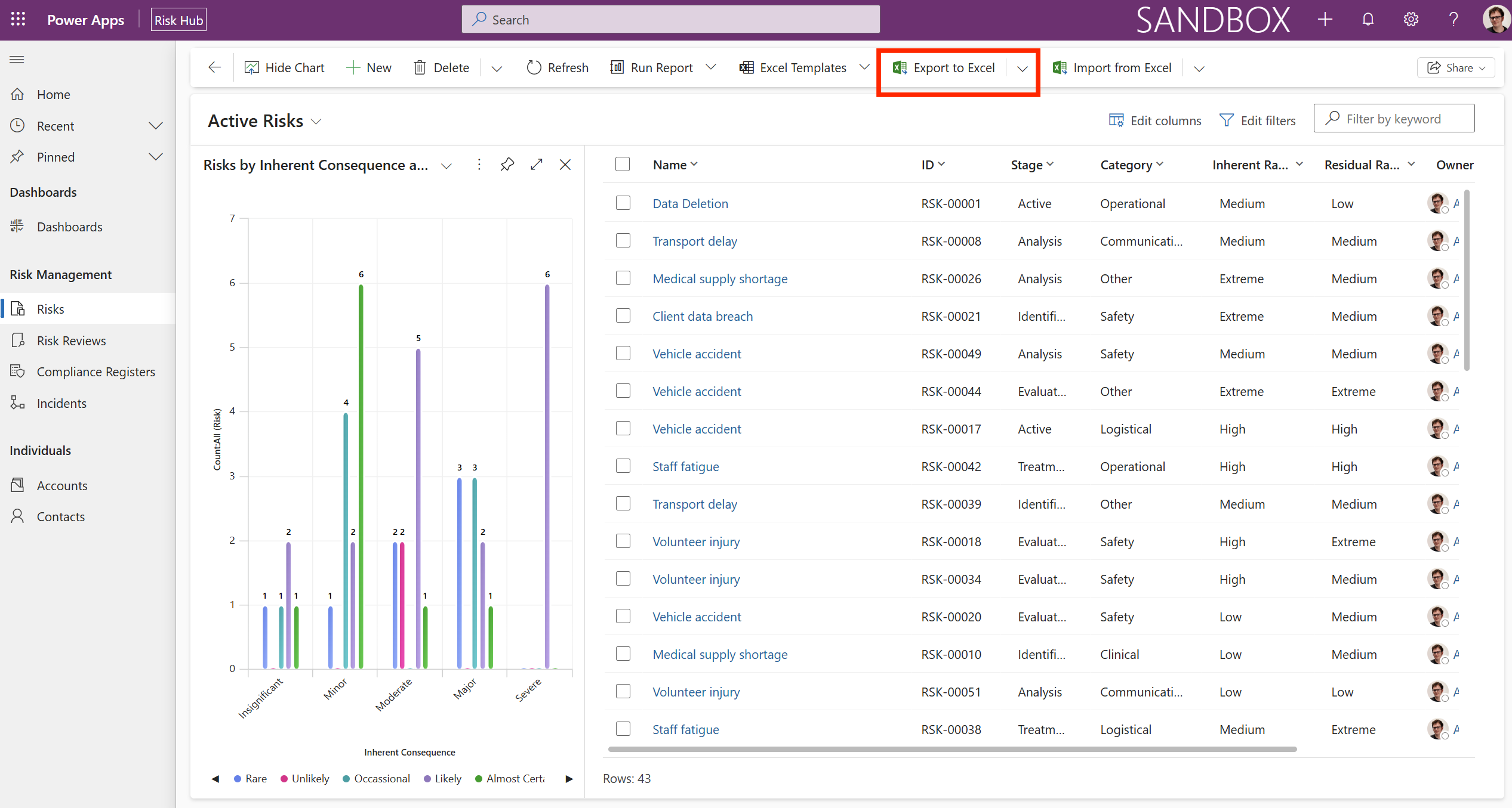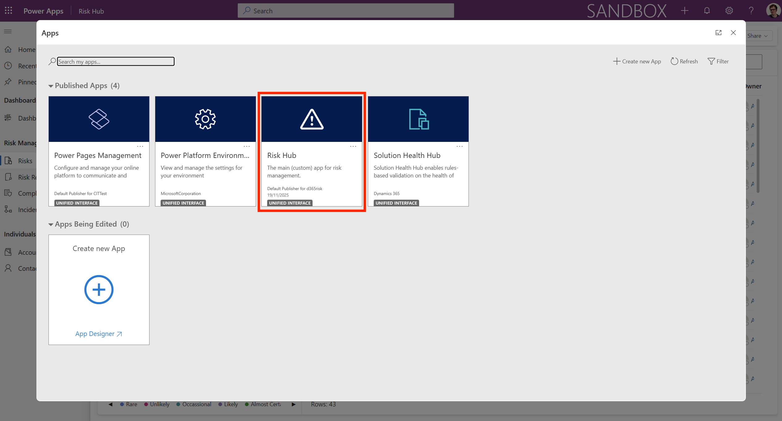 Once inside Power Apps, locate and select Risk Hub from your available applications. This will open the main workspace for risk management activities.