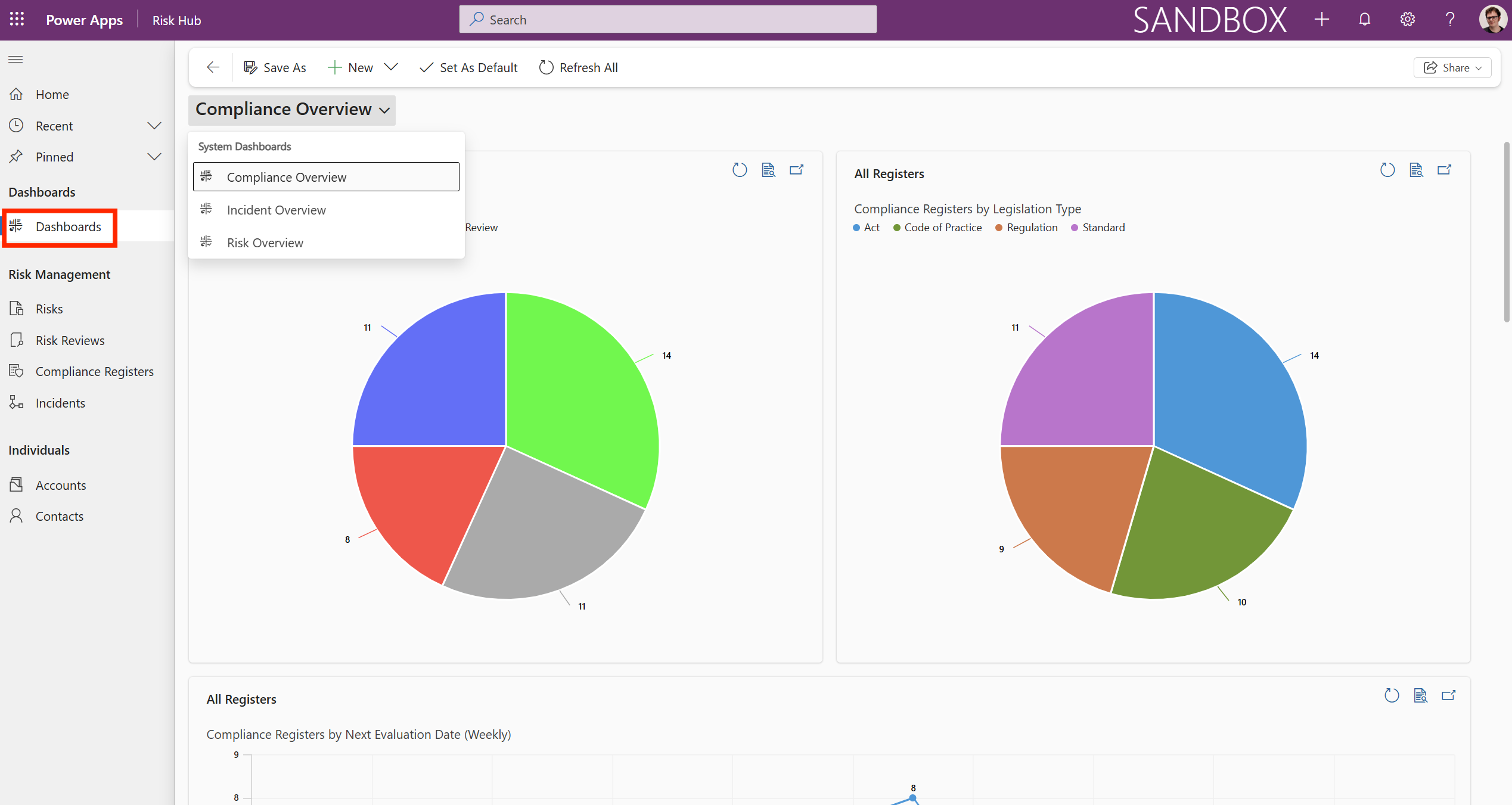 Click on the name of the dashboard to open it. Standard dashboards display risk heat maps, trend analysis charts, open action lists, and summary statistics (e.g., risks by type, number of overdue reviews, etc.).