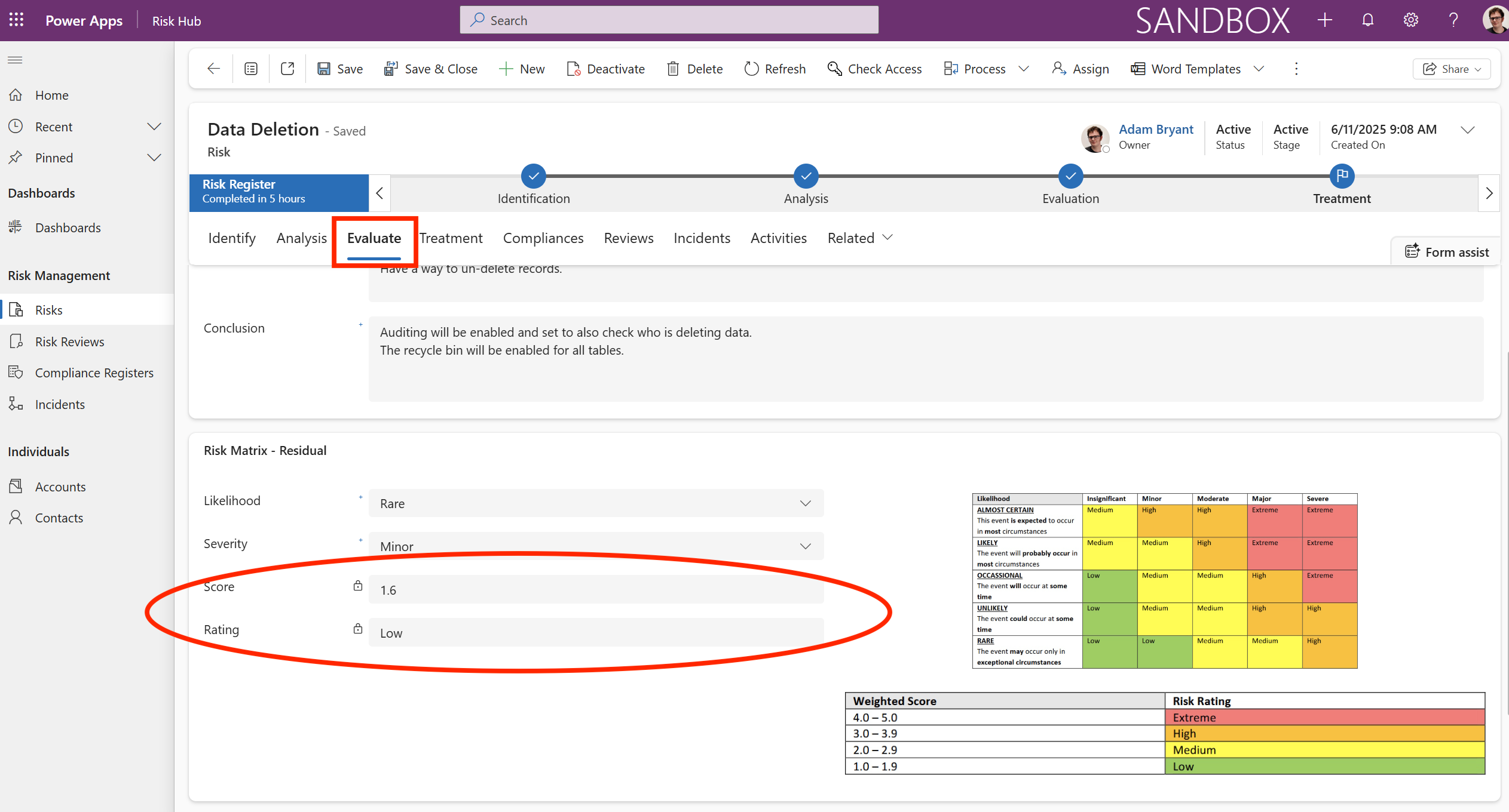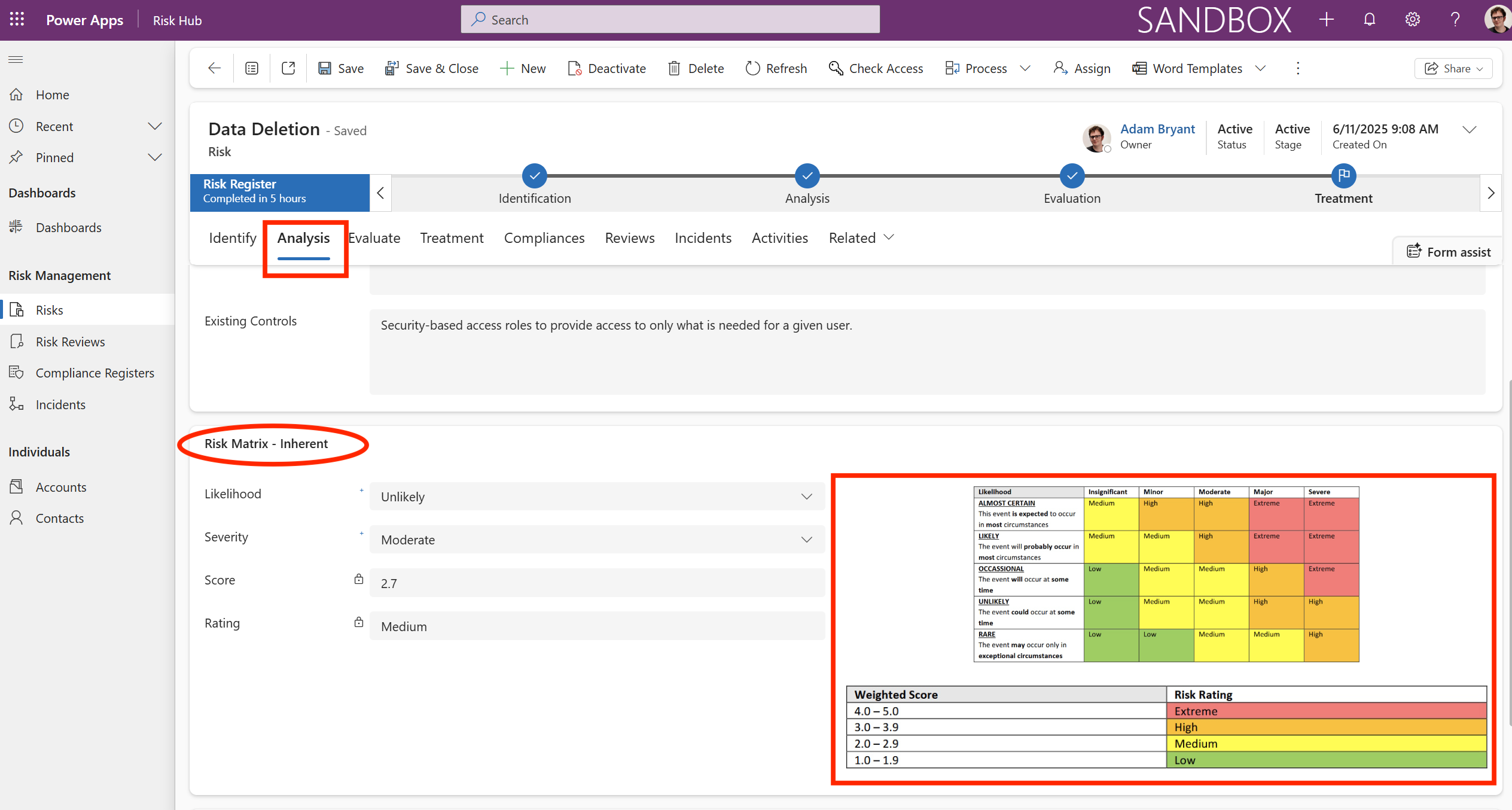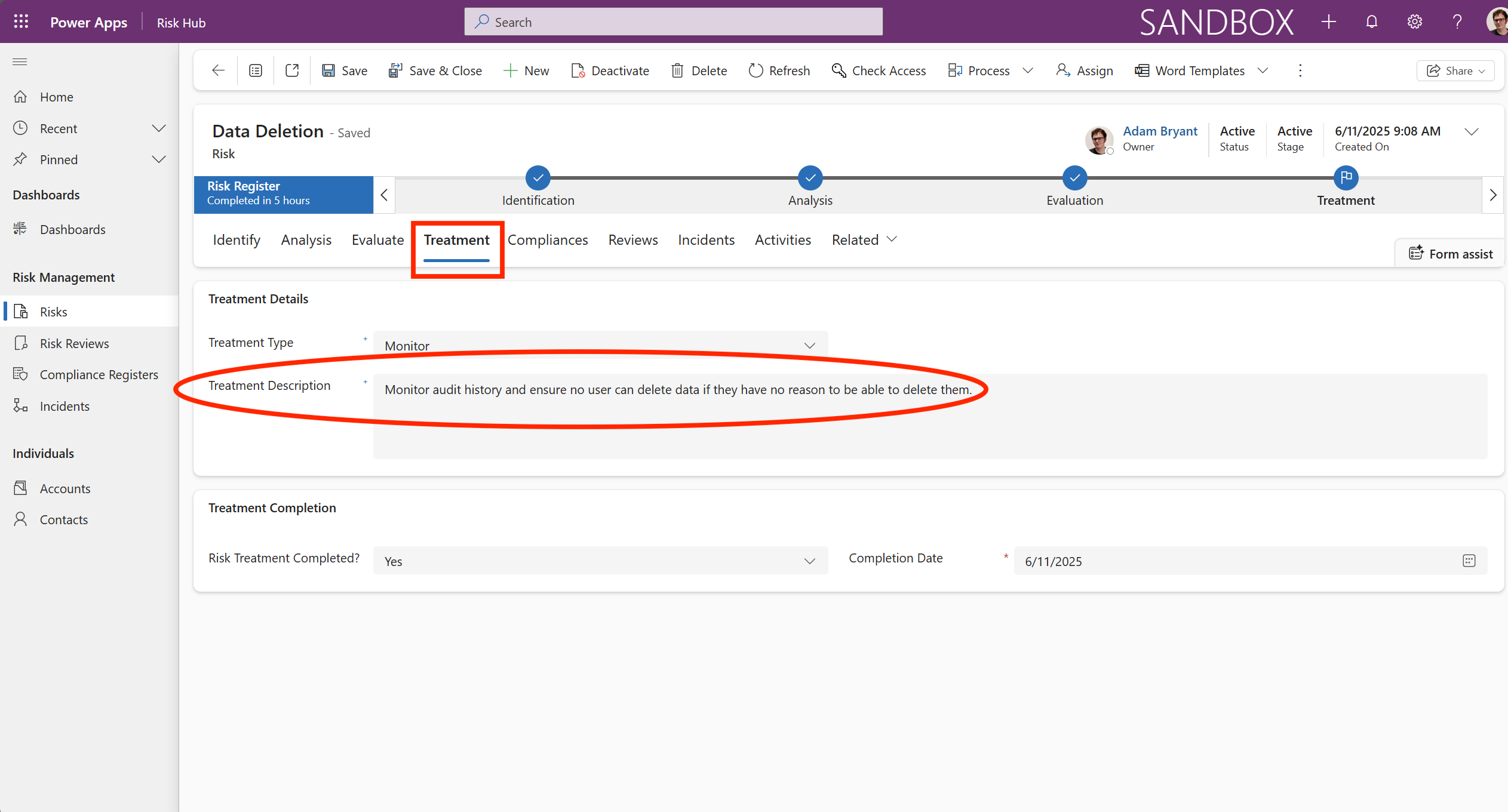 The Treatment tab outlines the proposed mitigation of actions and subsequent residual risk assessment.